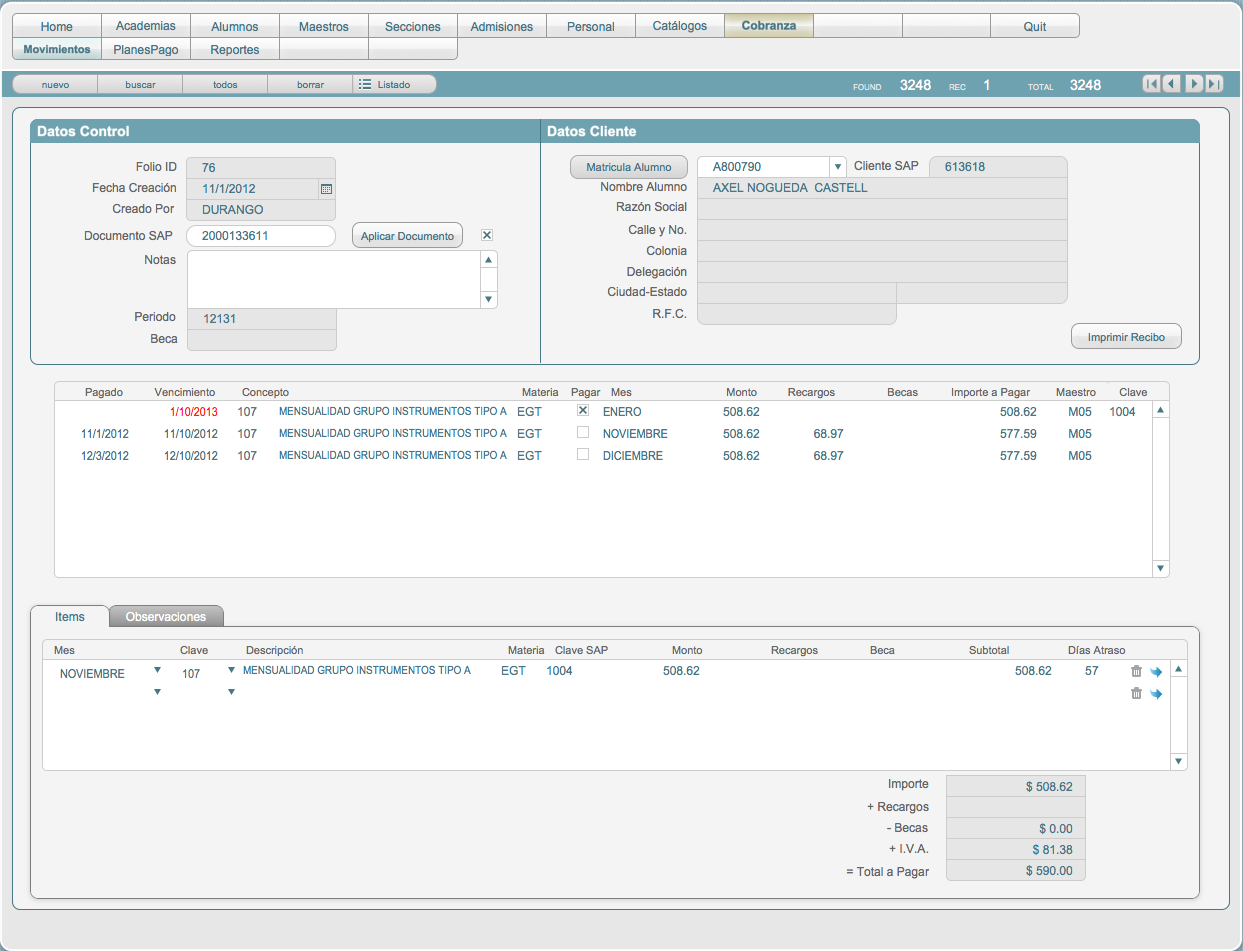 Registro de todos sus conceptos de cobranza y calendarizar sus pagos.