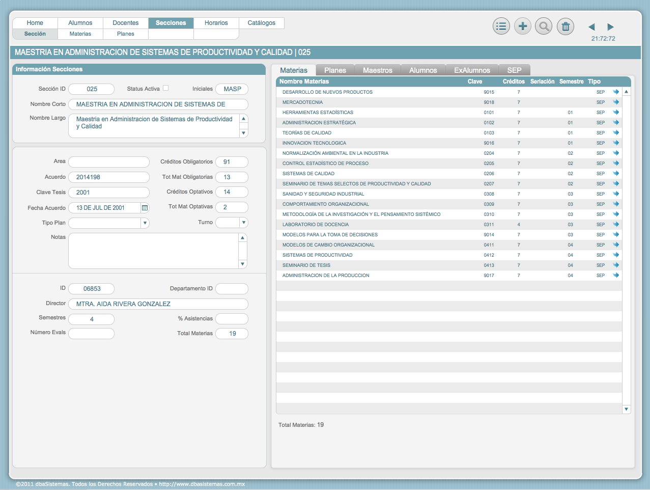 Registro de toda la información curricular del docente; titulaciones, articulos publicados, grados de estudios, etc.